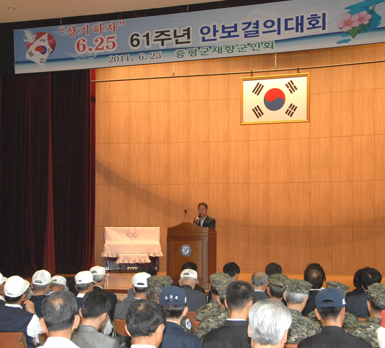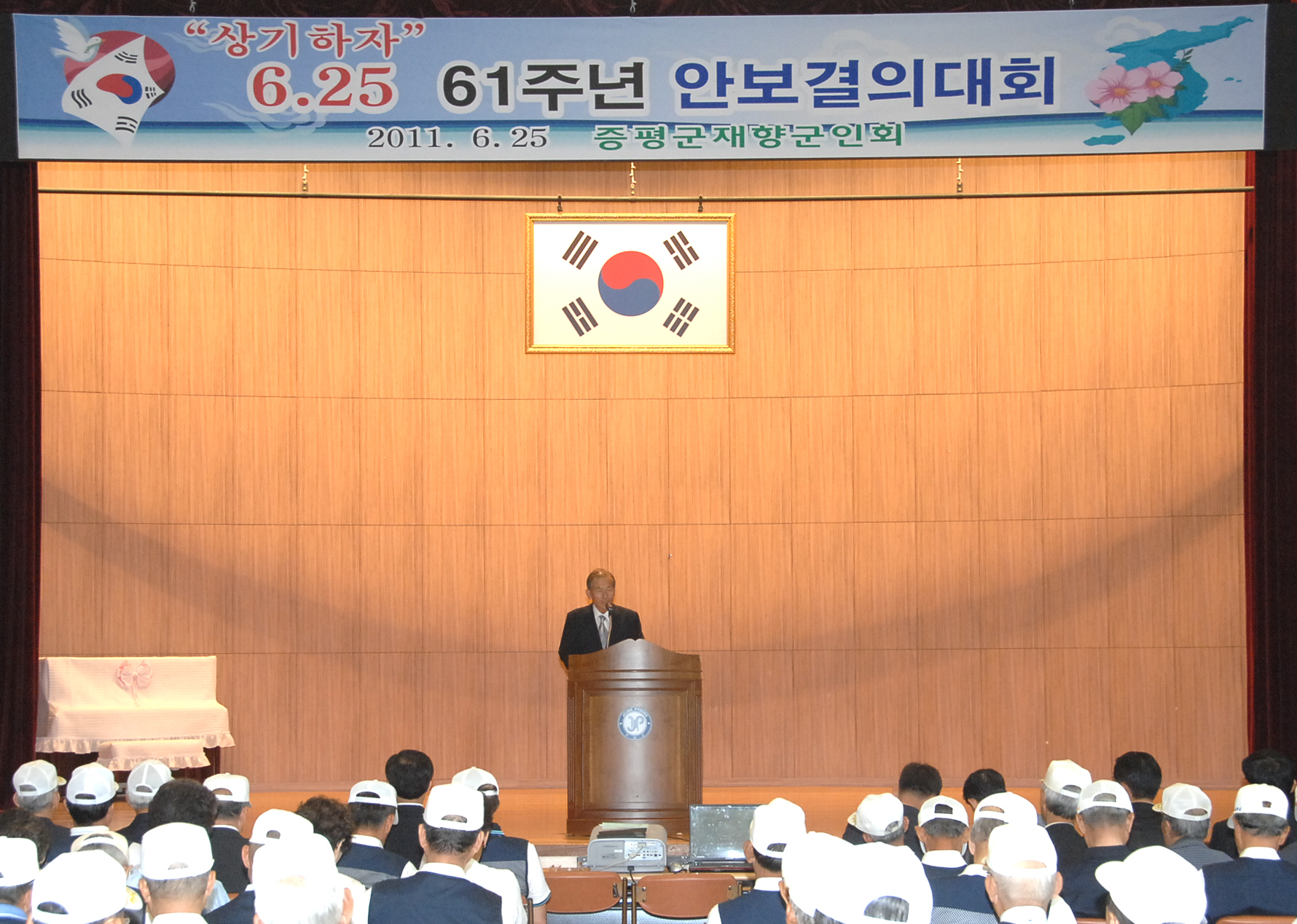 증평군재향군인회(회장 육재동)에서는 25일 오전 11시 증평읍 내성동 청소년 수련관에서 홍성열 군수, 김재룡 군의장과 군의원, 정은영 6.25참전유공자회장을 비롯해 보훈단체 회원 및 주민 등 300여명이 참석한 가운데 6.25전쟁 제61주년 기념행사를 가졌다.[보도자료실 참조]