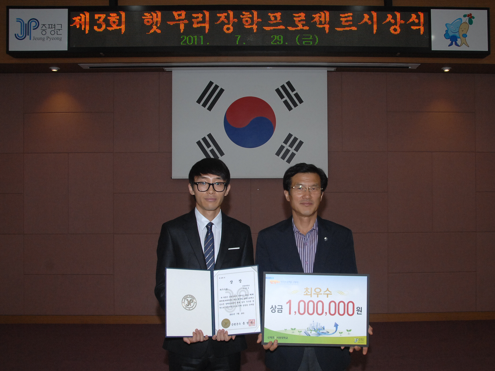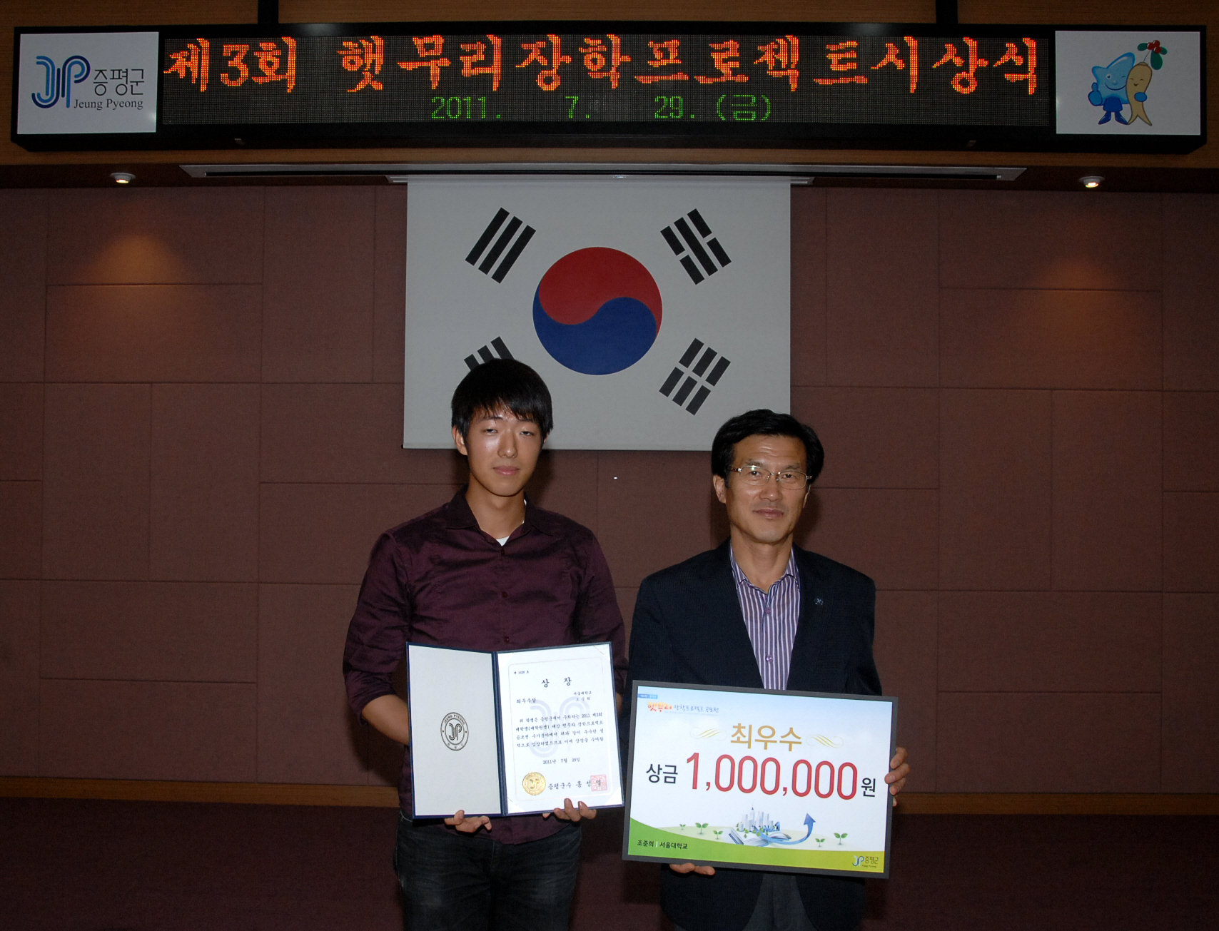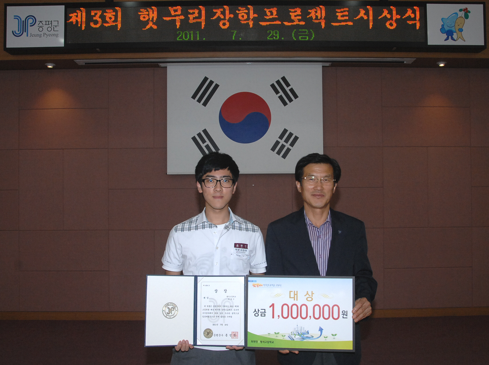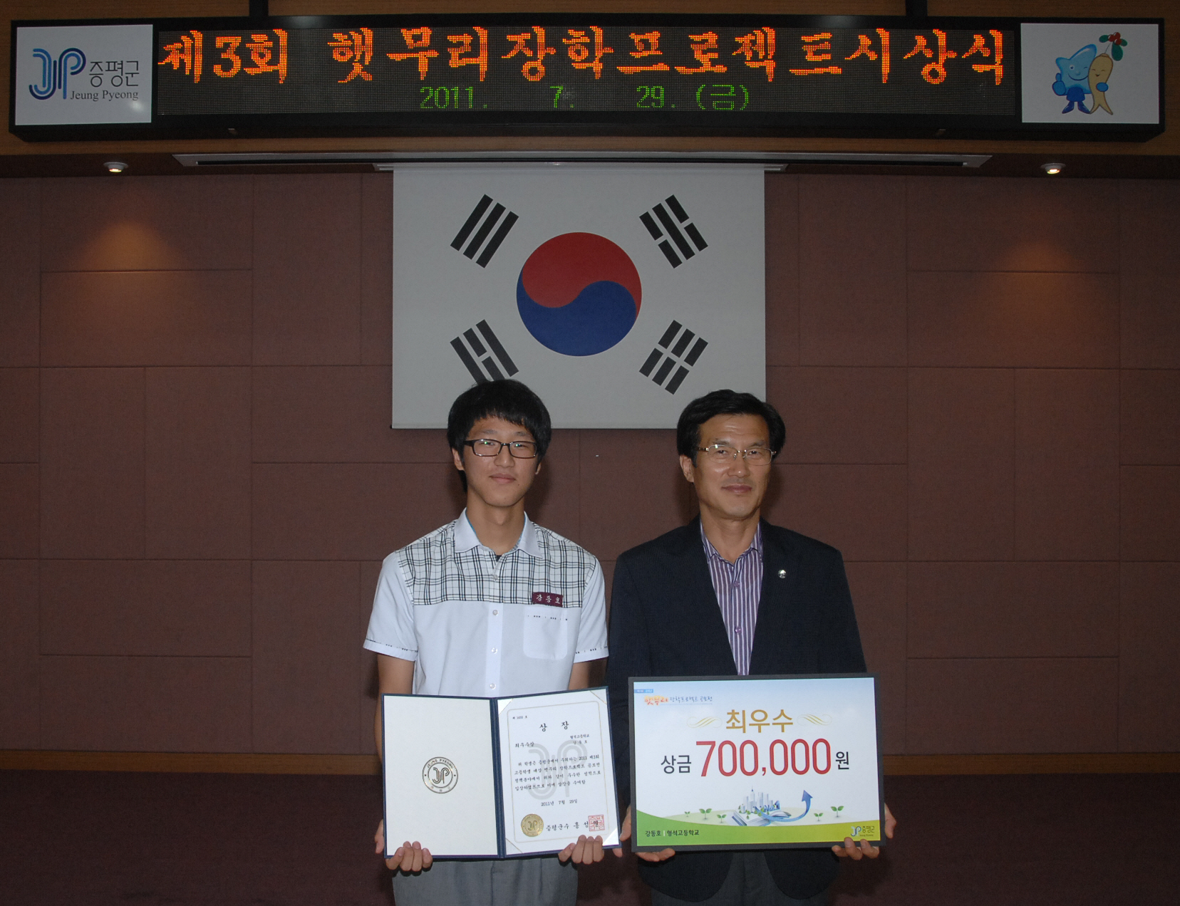 증평군(군수 홍성열)이 전국 고등학생, 대학생 및 대학원생을 대상으로 실시한 제3회 햇무리 장학프로젝트 공모전에서 형석고등학교 최현민 학생이 대상을 수상을 차지한 가운데 29일 오후 4시 군청 대회의실에서 시상식이 열렸다. [보도자료실 참조]