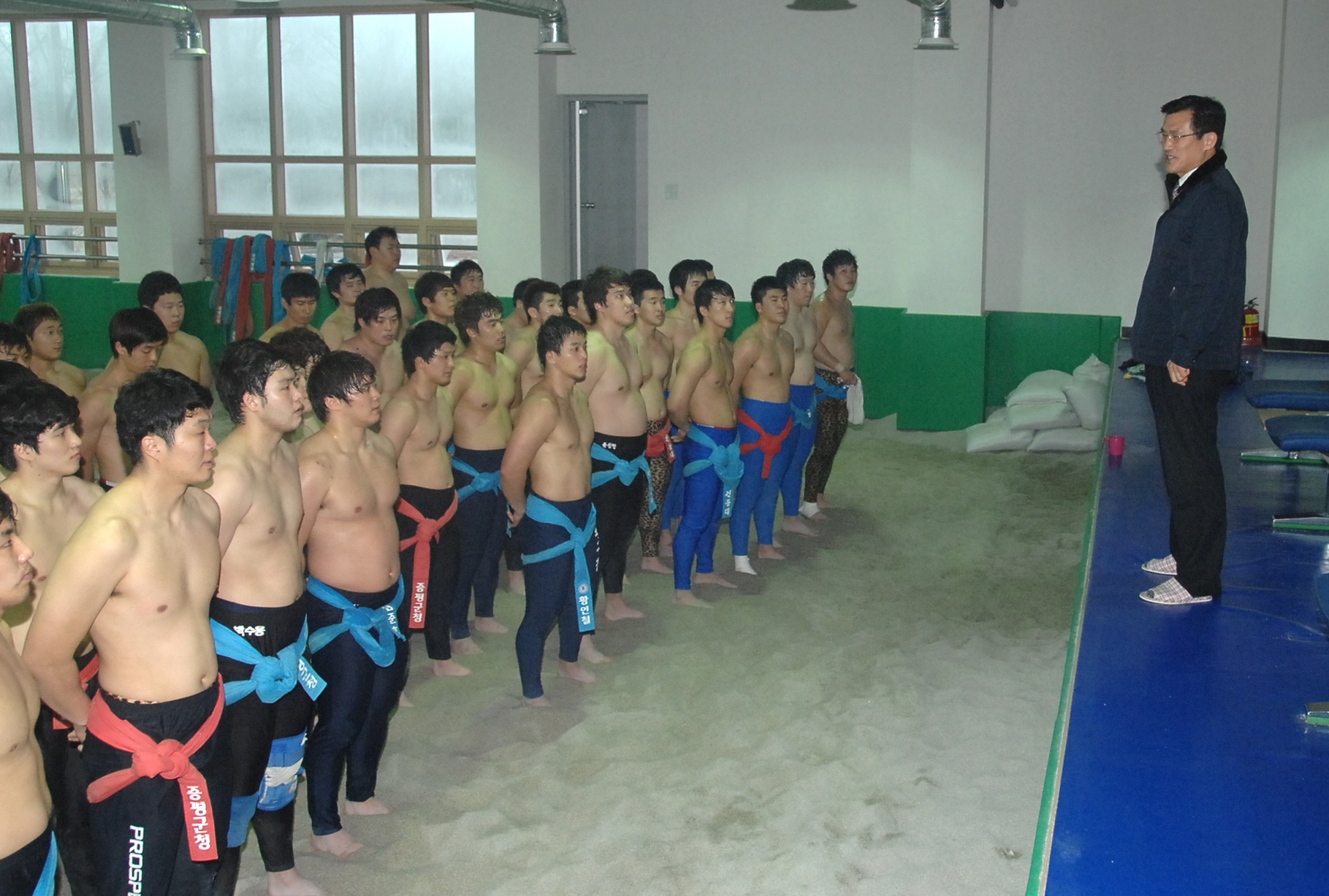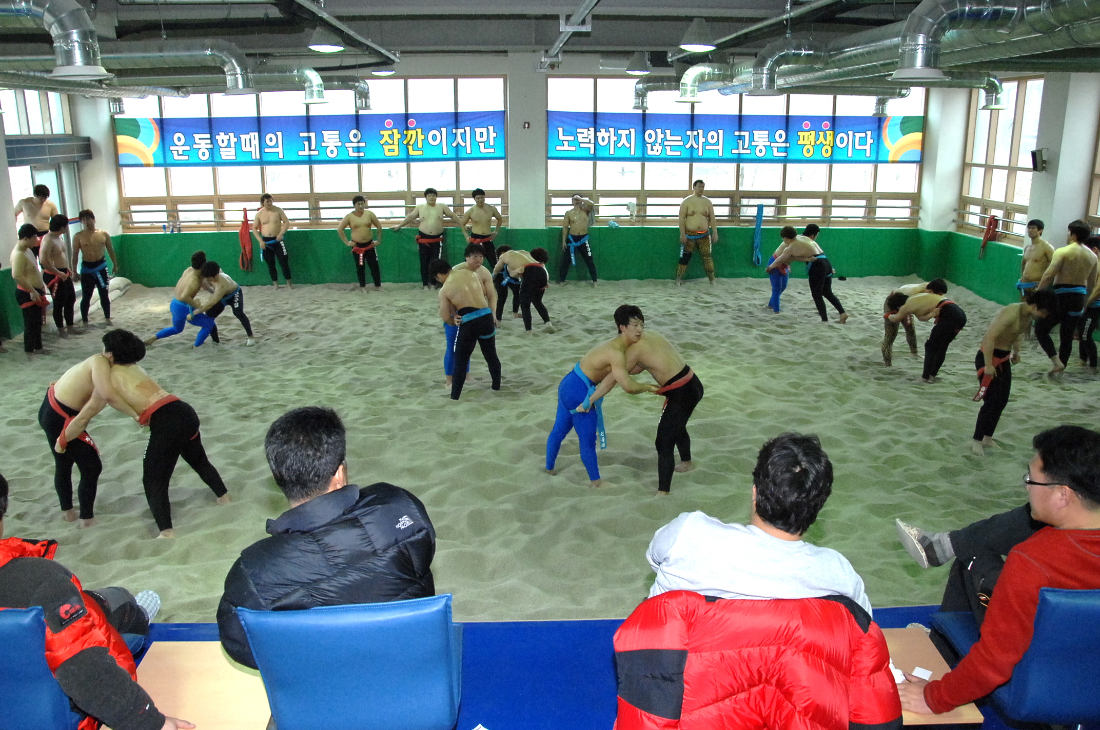 증평군 증평읍 송산리에 위치한 증평군씨름장이 동절기 전지훈련팀들의 씨름열기로 한 겨울 추위를 녹이고 있다.[보도자료실 참조]