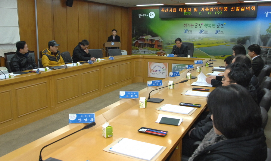증평군은 13일 오전11시 소회의실에서 축산단체 임원 및 관계자 등 20여명이 참석한 가운데 2013년 주요 축산사업 대상자 선정 및 가축방역 약품선정 심의회를 개최하고 축산사업 추진에 대한 세부사항을 논의 했다.[보도자료실 참조]