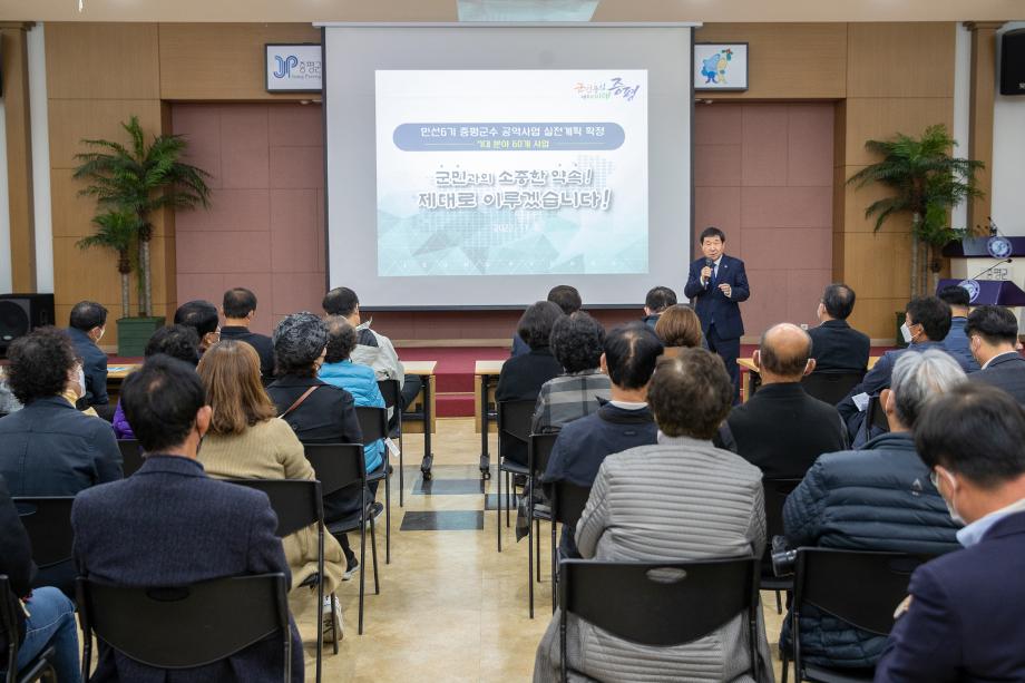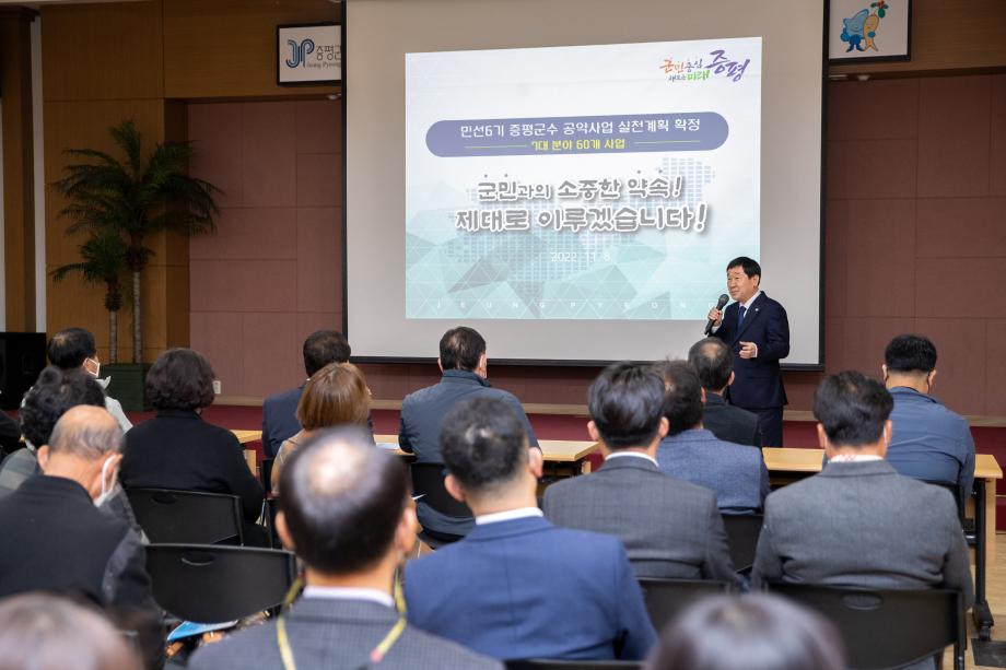 증평군은 8일 군청 대회의실에서 지역주민 및 사회단체, 기업인 등 60여명이 참여한 가운데 민선6기 이재영 군수의 공약사업 실천계획을 확정·발표했다.