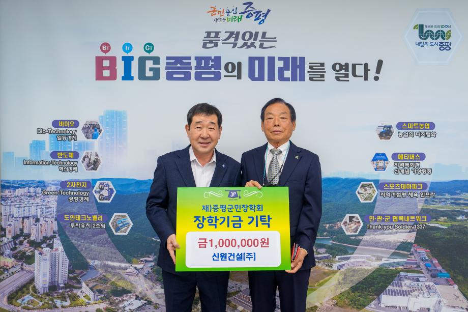 10일 군청을 찾은 신원건설은 (재)증평군민장학회와 증평군장애인체육회에 각 100만원을 기탁했다.