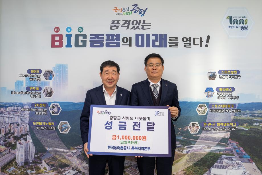 한국농어촌공사 충북지역본부(본부장 최현수)와 괴산증평지사(지사장 송서호)가 16일 증평군청에 방문해 각 100만원, 50만원의 성금을 전달했다.