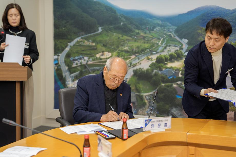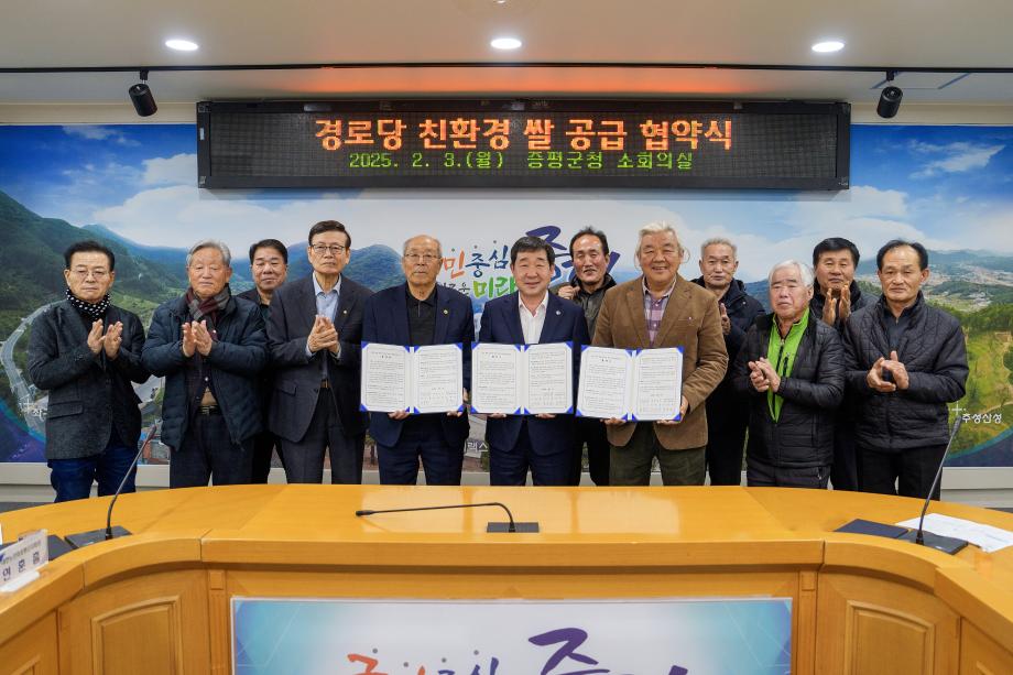 충북 증평군이 3일 군청 소회의실에서 (사)대한노인회증평군지회(회장 연훈흠), 증평친환경영농조합법인(대표 정창수)과 지역 내 경로당 친환경 쌀 공급을 위한 협약을 체결했다.