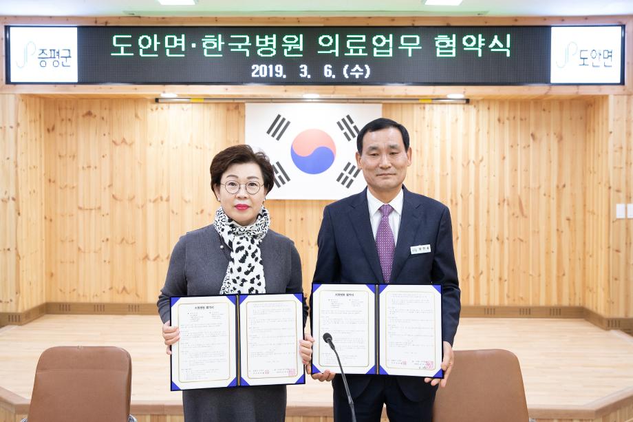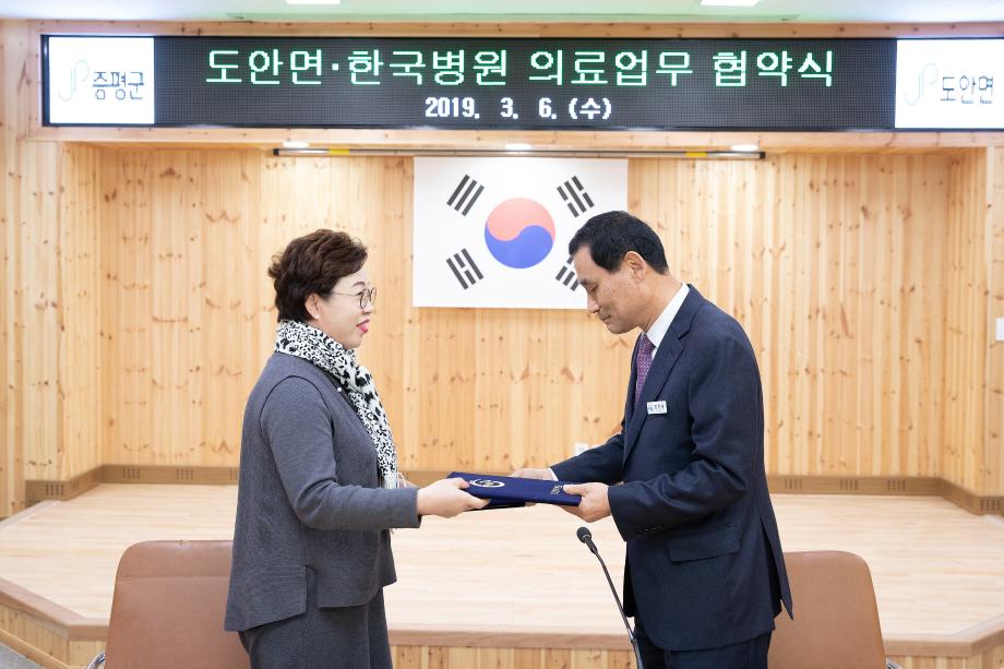 도안면(면장 임헌출)이 6일 면사무소에서 의료법인 인화재단 한국병원(원장 송재승)과 의료업무 협약을 맺고 주민보건 및 의료의 질 향상에 힘 써나가기로 약속했다.