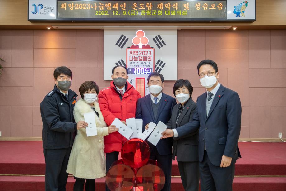 증평군이 9일 오후 1시 증평군청 대회의실에서 ‘희망2023나눔캠페인’사랑의 온도탑 제막식 및 현장 모금 행사를 진행했다.
