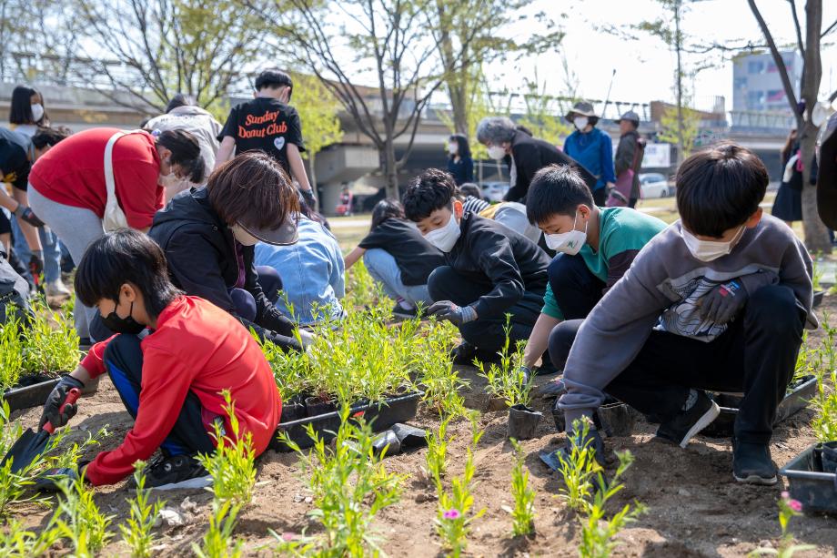 증평군은 증평초등학교 5학년 학생들과 함께 3일 보강천 미루나무숲에서 ‘함께 돌보는 꽃밭 조성사업’ 행사를 진행했다.
