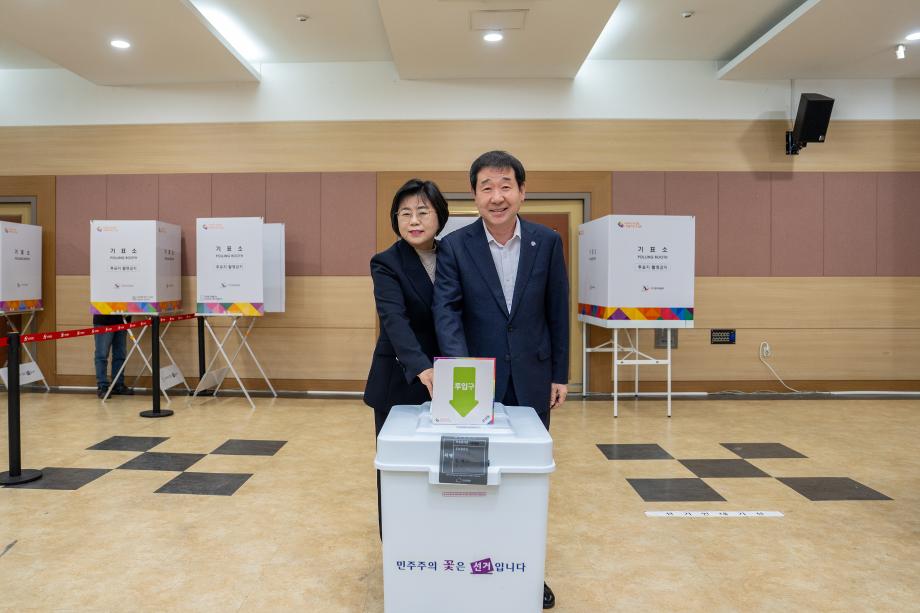 제22대 국회의원선거 사전투표 첫날인 5일 충북 증평군청 대회의실에 마련된 증평읍제2사전투표소에서 이재영 증평군수와 부인 이하숙 씨가 투표하고 있다.