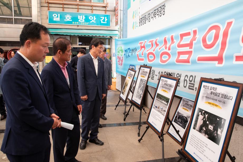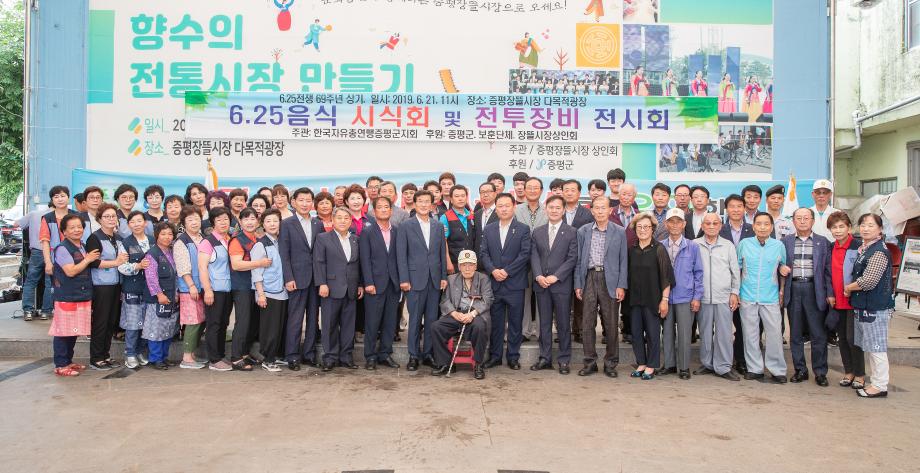 한국자유총연맹증평군지회(회장 송원호)는 6.25 전쟁 발발 69주년 및 호국보훈의 달을 맞아 21일 증평장뜰시장 다목적광장에서 6.25 음식체험 및 사진․전투장비 전시회를 개최했다.