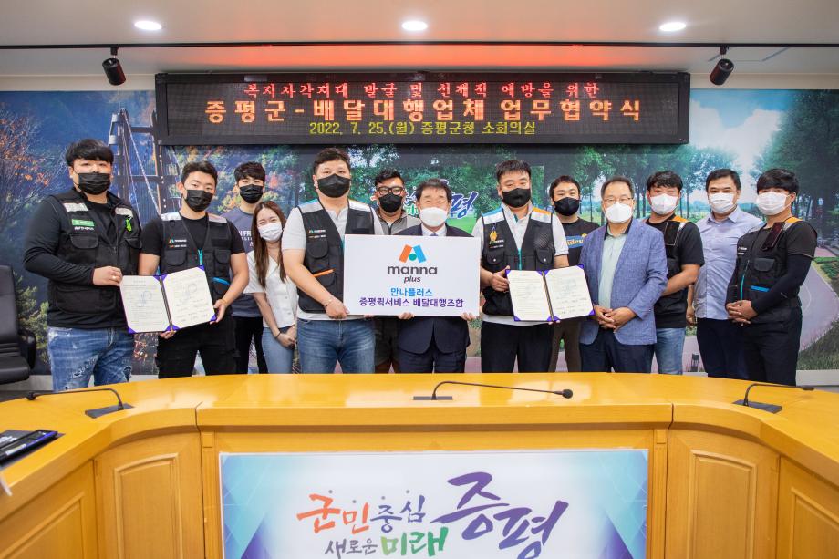 증평군은 25일 프렌즈퀵서비스, 제트콜서비스, 대한퀵서비스, 고고퀵서비스 등 지역 배달대행업체들과‘복지사각지대 발굴 및 선제적 예방을 위한 협약’을 체결했다.