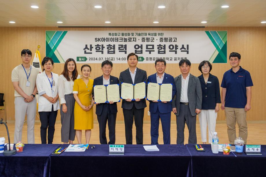 충북 증평군이 19일 지역 소재 기업인 SK아이이테크놀로지(주)(대표이사 김철중), 증평공업고등학교(교장 박한수)와 함께 특성화고 활성화 및 기술인재 육성을 위한 업무협약을 체결했다.